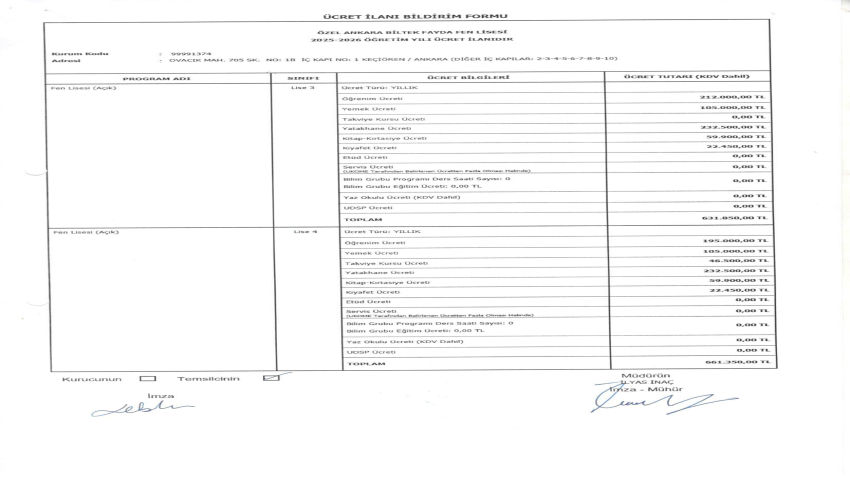 ÖZEL ANKARA BİLTEK FAYDA FEN LİSESİ ÜCRET İLANI