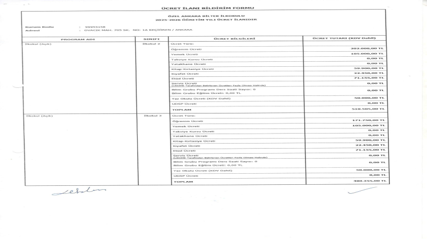 ÖZEL ANKARA BİLTEK İLKOKULU ÜCRET İLANI