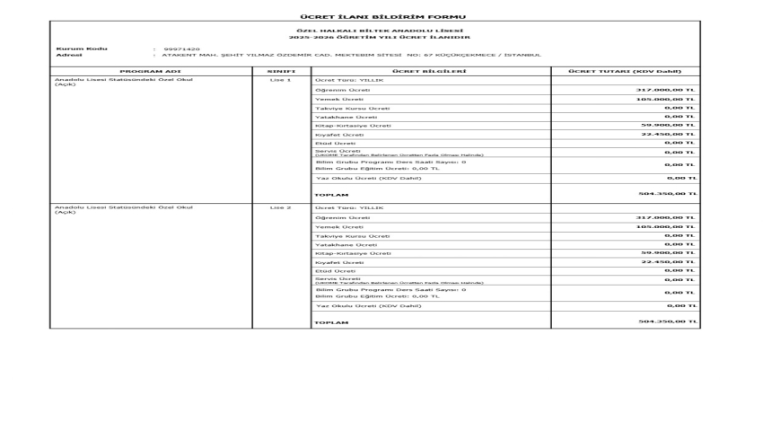 ÖZEL HALKALI BİLTEK LİSESİ ÜCRET İLANI
